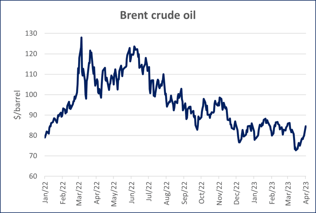 Oil prices rose by ~8% after Saudi Arabia led OPEC+ announced a surprise oil production cut on April 2, 2023. Voluntary production cuts by OPEC+ members amount to a total of 1.6 mbpd (million barrels per day), almost 2% of global oil demand.
