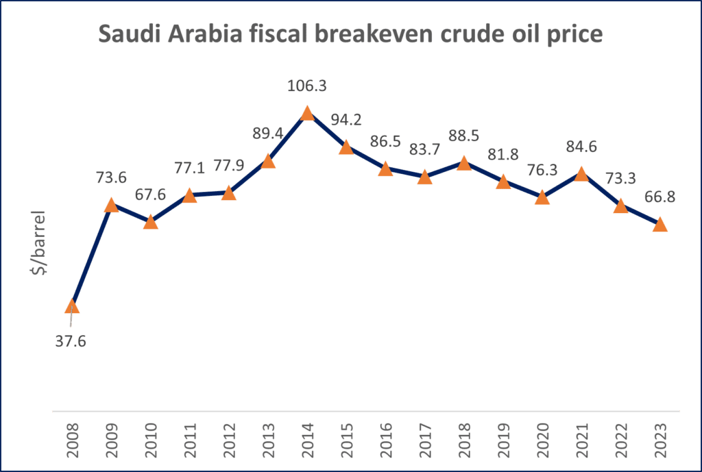 Saudi is using output cuts to move oil prices away from its fiscal breakeven