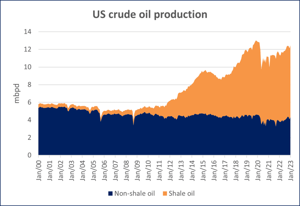In 2023, brent crude price fell from its high of $88.2/bbl in January to $72.8/bbl in March. The current production cut by OPEC+ is in the light of concerns over global growth and weak oil demand. Moreover, Saudi Arabia isn’t too happy about the fact that the U.S. will replenish its reduced strategic reserves slowly over time. Major oil exporting nations (OPEC+) suffered a huge deal of loss in their oil export revenues as U.S. shale oil flooded the market and drove down prices in the previous decade. Moreover, the COVID pandemic reduced global oil demand by ~10%. While the OPEC+ nations have been following strategies to diversify their economies away from oil in recent years, currently oil still plays a major role. OPEC+ has been able to gain its pricing power back after almost a decade as Russian oil remains under sanctions, and U.S. shale seems to have peaked out. Investors in U.S. shale over the last few years have focused on returns and financial discipline as opposed to mindlessly increasing output.